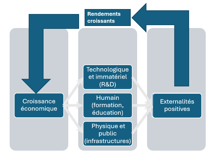 - Il est induit par l’apprentissage : quand on accumule du capital physique, via l’investissement, on accumule aussi de l’expérience. L’investissement en capital physique d’une firme accroît sa productivité, mais aussi celle des autres firmes de son environnement selon un effet « Silicon Valley ». Plus on investit, plus on produit, plus on accumule d’expérience et plus l’efficacité augmente.