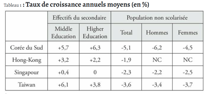 Selon Lee Jong-Won, le capital humain a constitué, entre 1960 et 1990, le facteur décisif de la croissance économique coréenne [1]. C’est l’une des raisons fondamentales de l’avance prise sur d’autres pays émergents tels que Hong-Kong, Singapour ou Taiwan. Plus étonnant, si l’on retient comme critère la croissance des effectifs dans l’enseignement secondaire ou le recul des enfants non scolarisés, notamment chez les femmes, il apparaît que la Corée du Sud a pris l’avantage sur les autres dragons asiatiques.